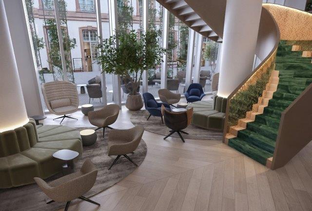 Die neue Lobby im Erdgeschoss mit angrenzender Lounge und Bar wird künftig als einladender Ort der Begegnung und Entspannung gestaltet. Warme, indirekte Beleuchtung, sanft geschwungene Holzoberflächen und helle Naturtöne bilden einen beruhigenden Kontrast zur Dynamik der Stadt und schaffen eine Atmosphäre, die sowohl entspannend als auch inspirierend wirkt.
