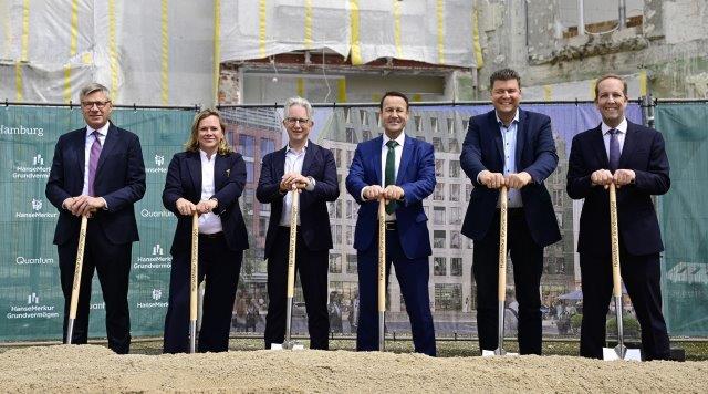 V.l.: Raik Mildner (Vorstandsvorsitzender HMG), Celia-Isabel Vietmeyer (Vorstand Quantum), Malte Andes (stellv. Vorstandsvorsitzender HMG), Eberhard Sautter (Vorstandsvorsitzender HanseMerkur), Finanzsenator Dr. Andreas Dressel und Ulrich Haeselbarth (Vorstand HMG) beim Spatenstich. Fotocredit: HanseMerkur Grundvermögen AG