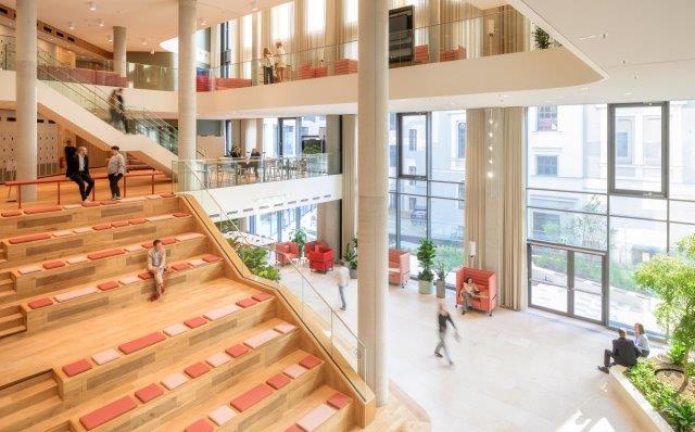 Für größtmögliche Nutzerfreundlichkeit wählte man einen partizipativen Ansatz, bei dem sich die Beschäftigten auf vielfältige Weise über den gesamten Prozess vom Rückbau des Altbaus bis zum Einzug in den Neubau einbringen konnten. Als zentrale Plattform zum Austausch diente ein digitales Kommunikationsformat, bei dem die Projektleiter über die Baufortschritte berichteten, die Beschäftigten Fragen stellen und Feedback geben konnten sowie bei Ausstattungsthemen einbezogen wurden. Multiplikatoren und Lotsen aus der Belegschaft unterstützten die verschiedenen Umzüge in die Übergangsquartiere und in den Neubau. Das entstehende Gebäude konnten sich alle Mitarbeitenden immer wieder im Rahmen von Baustellenbegehungen anschauen.