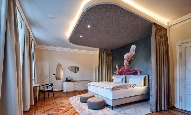 Mit der Villa Keller erweitern die Boesens ihr Portfolio um ein Haus, das Geschichte und Design in feinster Form vereint. Die als Wohnhaus der namensgebenden Familie Keller errichtete Villa wurde später als Gerberei- und Weingutsanwesen genutzt und in den vergangenen Jahren in engem Dialog mit dem Denkmalschutz behutsam saniert. Für die architektonische Neugestaltung zeichnet Britta Tibo aus dem nahegelegenen Trier verantwortlich, die den klassischen Stil des Hauses mit moderner Klarheit, hochwertigen Materialien und einem harmonischen Farbkonzept neu interpretiert hat. Edle Möbel von Dôme Deco, Polspotten, Paul Lindberg und Musterring treffen auf individuell gefertigte Stücke der Firma Schreiner Meier, ein in Saarburg ansässiges Traditionsunternehmen. Großzügige Fenster öffnen den Blick auf die Saar sowie die gegenüberliegende Burg während originale Stuckdecken und historische Parkettböden den unverwechselbaren Charakter der Villa bewahren. Besonders markant ist der filigrane Kettenvorhang von Kriskadecor über dem Chef’s Table im Restaurant Dopamin Fine Dining. Eine Übernachtung kostet ab 280 Euro für zwei Personen in der Saar Suite 1801 und ab 180 Euro im Comfort Zimmer, jeweils inklusive Frühstück.