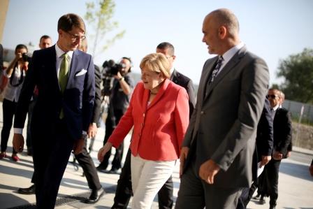 | Foto: Bundeskanzlerin Angela Merkel beim Besuch des Tirana Business Parks mit Premierminister Edi Rama und Michael Ulmer, © Blerta Kambo | |