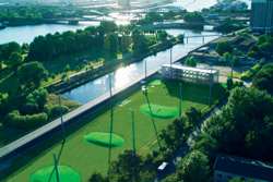 Nur 5 Minuten vom Hamburger Hauptbahnhof entfernt können Sie in Deutschlands einzigartiger Anlage Ihre Golfabschläge trainieren oder als Neugolfer die ersten Schwünge wagen.