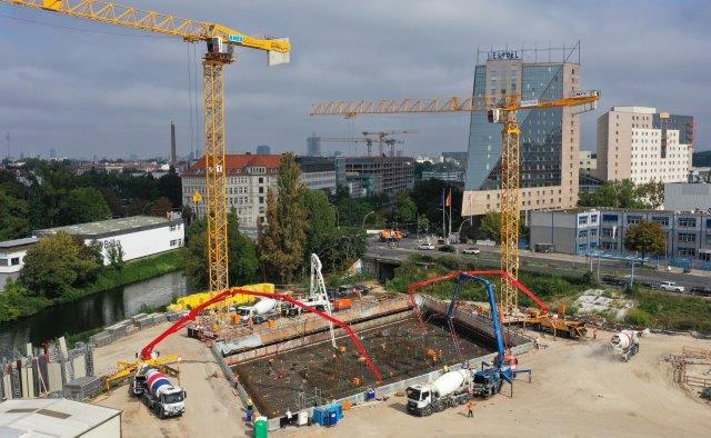 Am Donnerstag, den 25. August und am Freitag, den 26. August 2022 laufen die Arbeiten zur Fertigstellung der Bodenplatte des Estrel Towers auf Hochtouren. 800 LKW-Ladungen Beton steuern heute und morgen das Gelände an, um mit der Betonierung der Bodenplatte zu beginnen. Fast alle Betonlieferanten Berlins wurden zusätzlich zu der eigenen Betonmischanlage auf dem Gelände, die im Regelbetrieb alle Betonarbeiten für das Bauwerk abdeckt, für das Projekt beauftragt. Somit kann das Fundament für den Estrel Tower, der mit 176 Meter Berlins ho?chstes nicht-technisches Gebäude wird, gelegt werden.