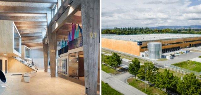 CIC – Coppenrath Innovation Centre, Osnabrück. Architect: KRESINGS. Developer: Ringlokschuppen Osnabrueck GmbH (links) und Wooden Logistic Property, Straubing. Architect: architektBALS. Developer: GARBE Industrial (rechts)