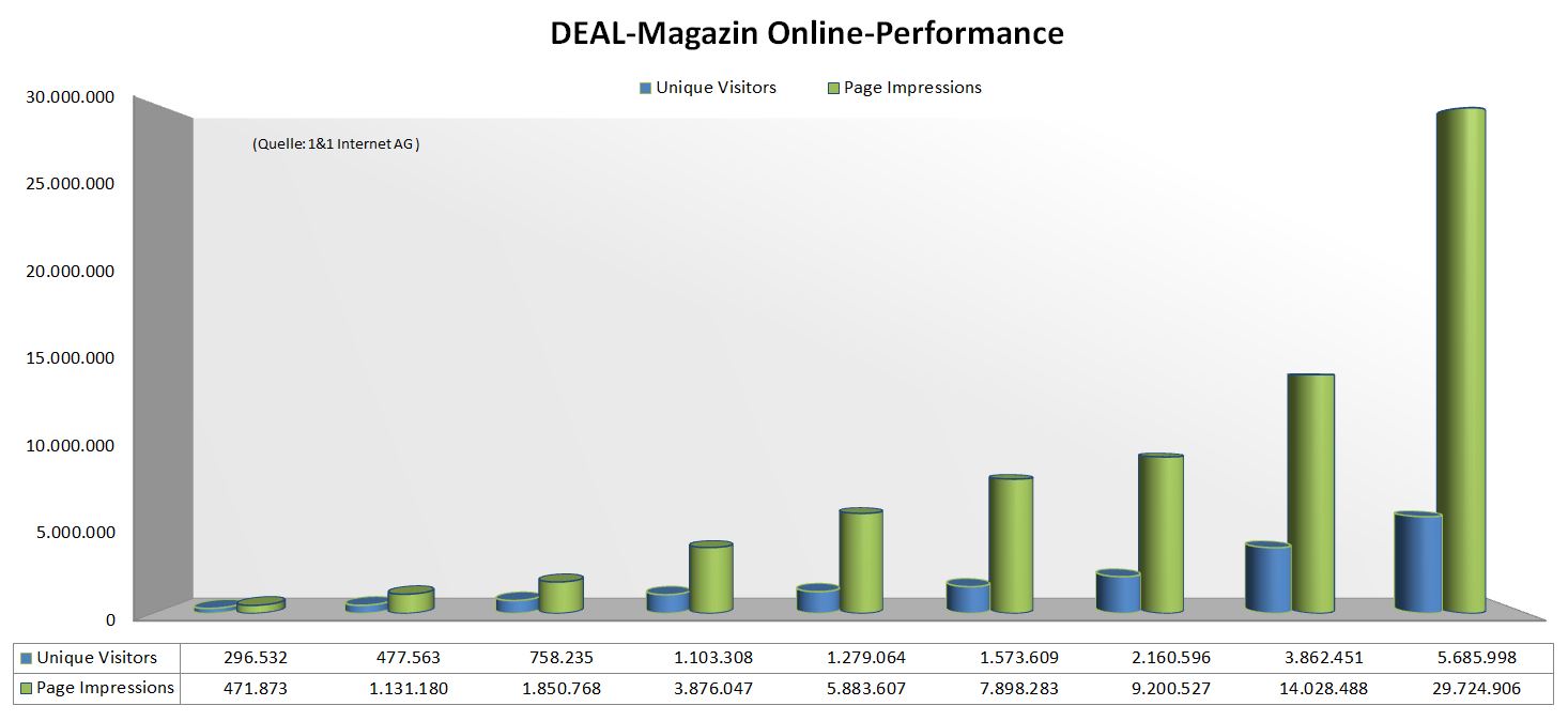 Das auf Immobilien- und Investmentthemen spezialisierte DEAL-Magazin hat im Jahr 2014 zum siebten Mal in Folge wiederum deutlich zugelegt und damit seine Marktakzeptanz als Informations- und Nachrichtenmedium in vollem Umfang bestätigt. Die Performancesteigerung von deutlich über 50 Prozent wird von den neuesten Zahlen der Besucherströme und Seitenzugriffen belegt, die jetzt bekannt gegeben wurden.