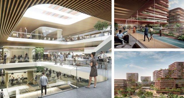Sieben in der Höhe gestaffelte und um einen begrünten Innenhof gruppierte Gebäude sind auf mehreren Ebenen über „sky walks“ und „sky gardens“ terrassenartig miteinander verbunden. Diese boulevardartigen Verbindungs- und Zwischenzonen sind wie auch die in Atrien und Lufträume eingestellten Treppenläufe mehr als Laufwege; vielmehr dienen sie als attraktive Begegnungs- und Kommunikationszonen zwischen den zonierten Arbeits- und Funktionsbereichen.
