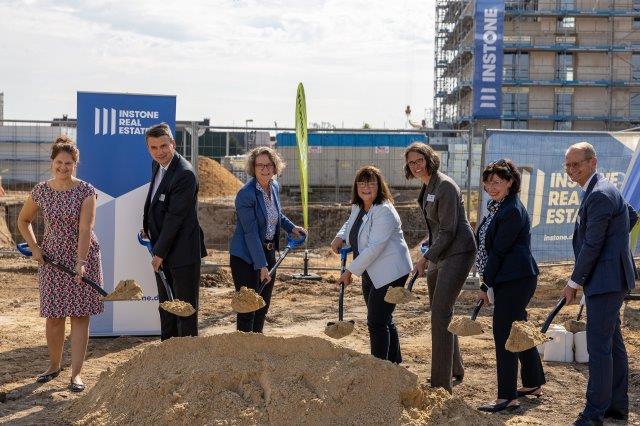 Am Vortag des „WOHNENRW-Tag“ ist am Donnerstag, 12. August 2021, der Startschuss für einen weiteren Bauabschnitt des Projekts „Wohnen im Hochfeld“ in Düsseldorf-Unterbach gefallen. Der Spatenstich ist der erste Schritt zu einem Wohnungspaket mit 52 öffentlich geförderten sowie 14 freifinanzierten Einheiten mit einer Gesamtwohnfläche von rund 5.050 m² und KfW55-Standard. Um der durch die Corona-Pandemie geprägten Situation Rechnung zu tragen, trafen sich hierzu gestern im kleinen Kreis Landesbauministerin Ina Scharrenbach, Bezirksbürgermeisterin Dagmar von Dahlen, Dr. Friederike Nesselrode, Leiterin des Amtes für Wohnungswesen, Ruth Orzessek-Kruppa, Leiterin des Stadtplanungsamts, Andreas Gräf, COO des Wohnentwicklers Instone Real Estate Group AG, und Lars von Lackum, Vorstandsvorsitzender (CEO) der LEG Immobilien SE.