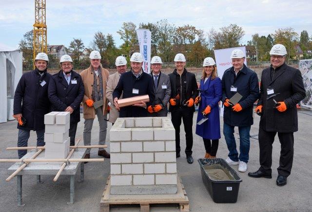 Grundsteinlegung für den Neubau der DSV-Gruppe mit Stefan Willwersch, Architekt und Gesellschafter der W2 Development GmbH (3. von links), Dr. Michael Stollarz, Vorsitzender der Geschäftsführung der DSV-Gruppe (5. von links), Thomas Fuhrmann, Bürgermeister für Wirtschaft, Finanzen und Beteiligungen der Stadt Stuttgart (6. von links) sowie Vertretern der Projektbeteiligten. Bildquelle: © DSV-Gruppe