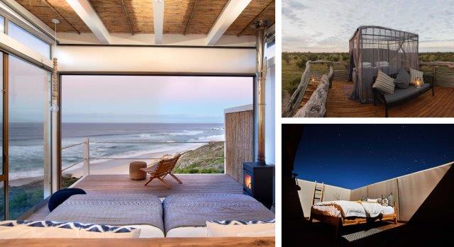 Lekkerwater Beach Lodge, Südafrika (links), Skybeds, Botswana (rechts oben) und Kwessi Dunes, Namibia. Fotocredits: © Natural Selection