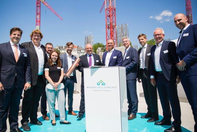 Zu den Gästen zählten neben dem neuen Endinvestor des Neuen Kanzlerplatzes, der Union Investment Real Estate, auch Vertreter der bereits bestätigten Mieter – zum einen die DB Privat- und Firmenkundenbank AG (ehemals Postbank) und zum anderen Deutschlands führender Corporate Coworking-Anbieter Design Offices. Ebenso vor Ort war das für den Entwurf und städtebauliche Konzept verantwortliche Kölner Architekturbüro JSWD sowie Aug. Prien und ROM als ausführende Bauunternehmen.